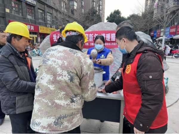 红豆、花生、糯米、黑米、桂圆、红枣......经过一两个小时的熬制,散发出浓浓的香味,趁热端到了项目工地。社区志愿者和社工动作娴熟地一碗又一碗盛出腊八粥,给户外劳动的工人们送去,“这个点能喝上一碗热粥,真是暖到胃也暖到心了”,一位工友笑呵呵地和志愿者说道。